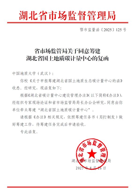 (通讯员:黄春波)2025年7月11日,湖北省市场监督管理局在我们组织召开了湖北省国土地质碳计量中心(以下简称“中心”)批筹评审工作会议。近日,经湖北省市场监督管理局正式批复,同意由ray电竞官网、湖北省测绘质量监督检验站、北京理加联合科技有限公司联合筹建该中心。中心由我们牵头组织建设,拟充分发挥“产学研”优势,共同打造具有碳源汇监测仪器设备计量、碳含量测试分析、碳汇计量和核算、区域碳排放计量、国土碳增汇等技术能力的团队。